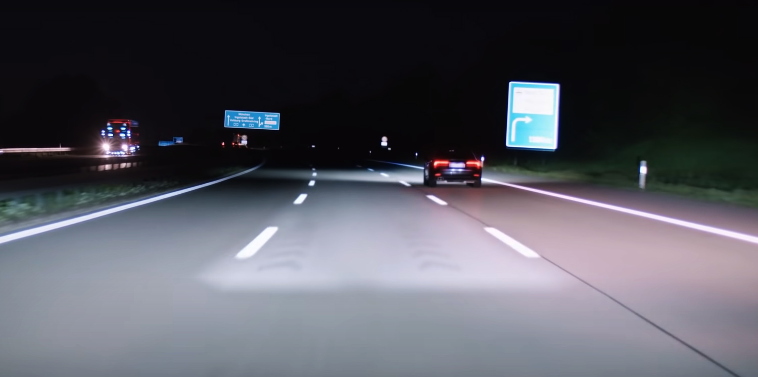 A 50-meter “light carpet” that is designed to keep light within the driver’s lane and extends the carpet left or right when changing lanes and helps to avoid a “blinding” effect for oncoming traffic.