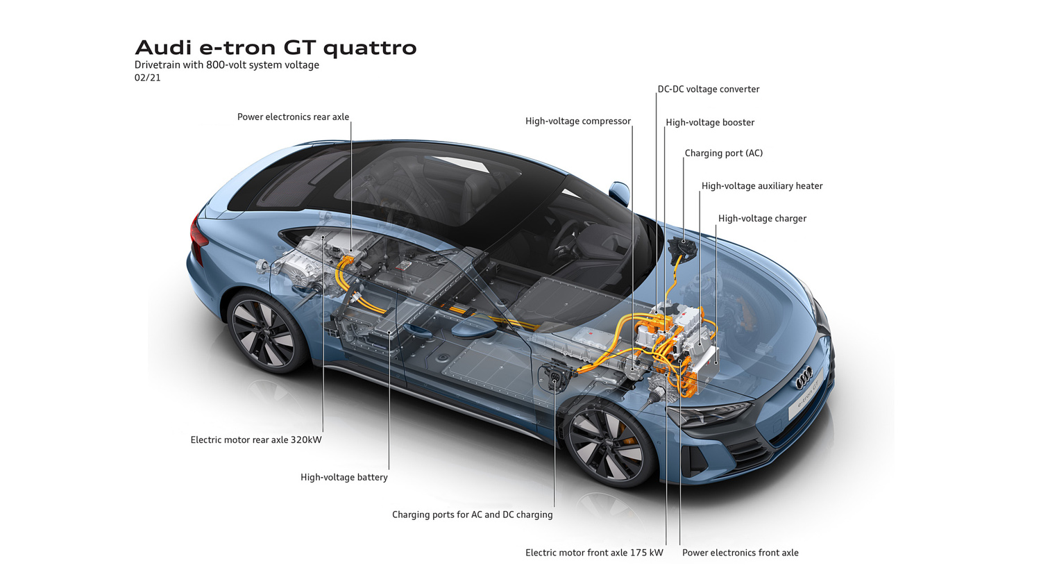 The Audi e-tron GT RS is a full electric vehicle (BEV). The maximum power of the Audi e-tron GT RS is 475 kW (637 hp). The maximum torque is 612 lb-ft. The Audi e-tron GT RS is all wheel drive and can accelerate from 0 to 62 miles per hour in 3.3 seconds. The top speed is 155 mph.