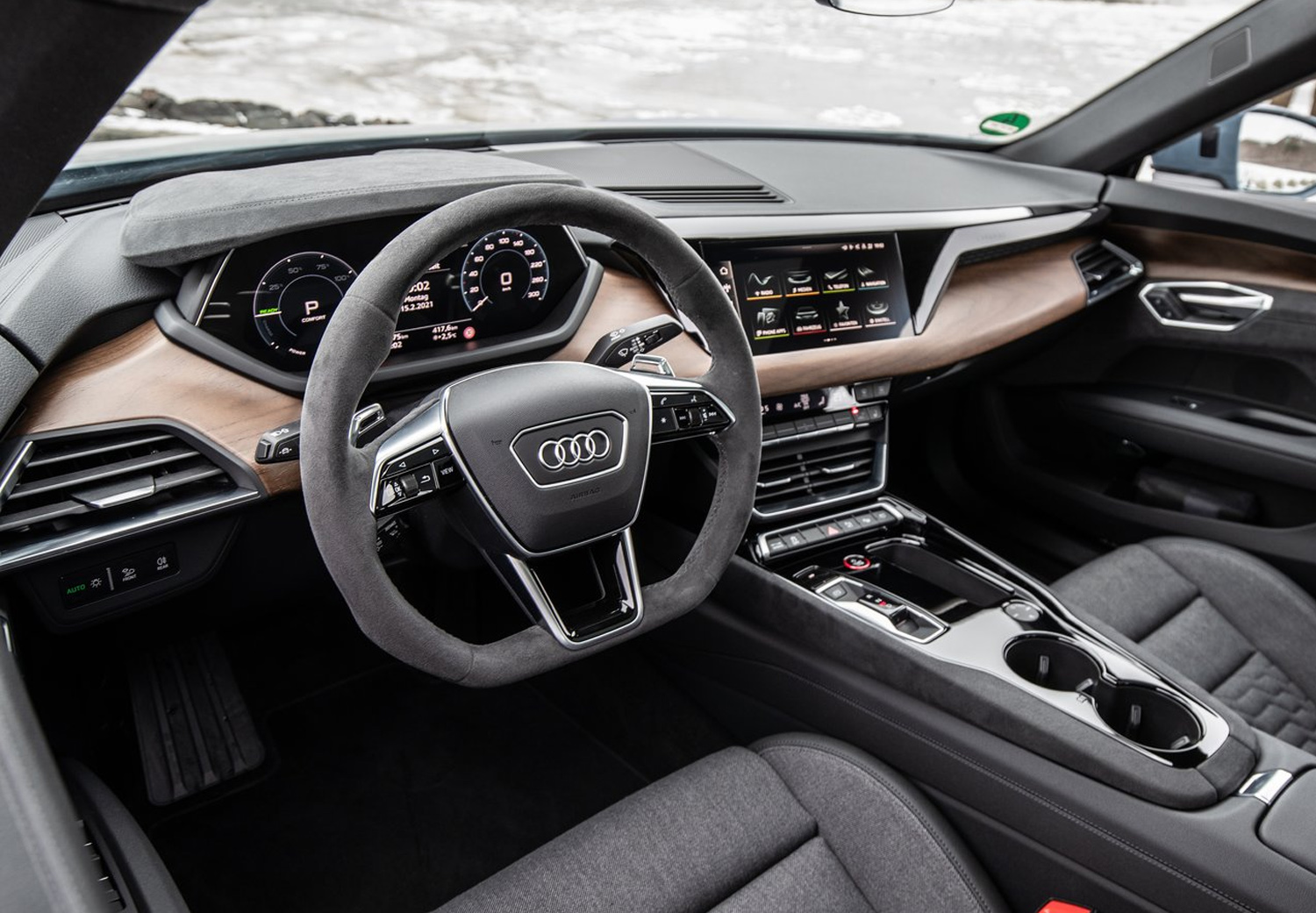 Inside, the e-tron GT quattro and RS e-tron GT design marries sporty ergonomics with passenger comfort. Even with their tapering rooflines, both cars effortlessly house up to 5 occupants. In front of the driver, the continuous horizontal lines of the dash hold a centre instrument console and touch screen panel that just seem to float. And front Sport seats, available in leather or leather-free, give optimum support, even when cornering at speed.
